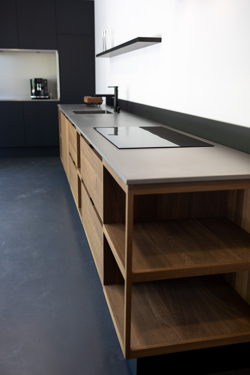Met de combinatie van gestoomd massief eikenhout, gestoomd eiken fineer, de open vakken, de bijpassende kastenwand en het geparelstraalde RVS-werkblad is deze keuken een perfecte mix van functionaliteit en stijl.